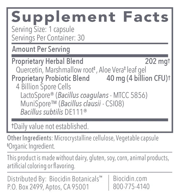 Støtter fordøyelsen og fordøyelseskomfort Bidrar til å håndtere sporadisk oppblåsthet, gass og fordøyelsesbesvær Fremmer næringsopptak Fremmer regelmessighet og normal avføring Opprettholder en sunn tarmbarriere Støtter mikrobielt mangfold og balanse i mage-tarmkanalen Fremmer en sunn inflammatorisk respons og immunhelse Støtter kardiovaskulær helse Barnevennlig støtte for mikrobielt mangfold og mage-tarmhelse Konkurransedyktig utelukkelse av ugunstige mikrober Funksjoner Tre klinisk undersøkte Bacillus-arter Evidensbaserte nivåer av sporedannende probiotika Organiske botaniske ingredienser Temperaturstabil (krever ikke kjøling) Overlever mage- og gallesyrer slik at de formerer seg i tarmene (små og store innen 4 timer) Kan tas sammen med antimikrobielle midler og/eller antibiotika Samtidig bruk med Biocidin® anbefales SIBO-trygg.